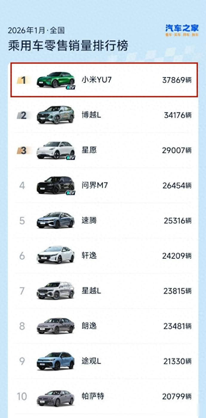 2026年1月,YU7卖出了37869台车,成为天下乘用车销量第又名,它跨越了祯祥博越L和星愿这两款车型,连特斯拉Model Y也掉到了第20名的位置,不外好多东谈主莫得属意到,这个第又名并不是霎时冒出来的,因为SU7在同庚2月肃穆停产了,之前统共录用了38万多台车,当今小米汽车在售的新车型只剩下YU7这一个型号,用户要是思买小米的电动车,就只可礼聘它。