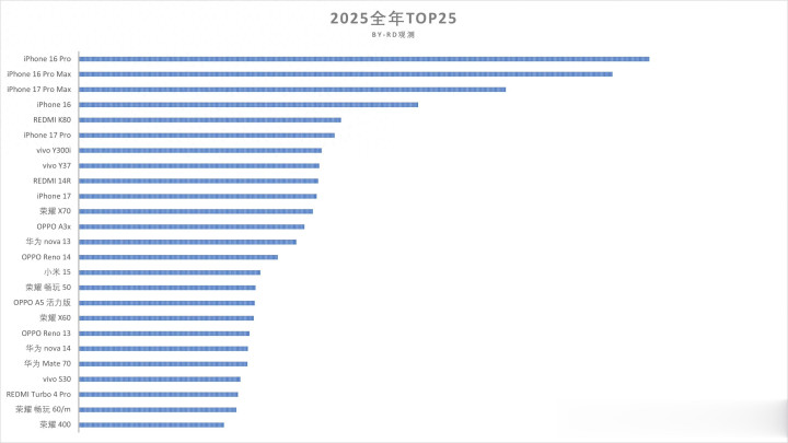 你看这张图,前四名雷打不动全是苹果:iPhone 16 Pro、16 Pro Max、17 Pro Max、iPhone 16。