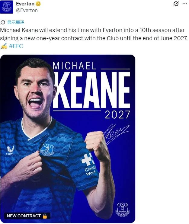 官方:埃弗顿秘书迈克尔-基恩续签了一年合同,这名中卫的新合同2027年到期。