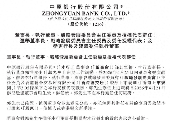 4月21日,华夏银行(证券代码:01216.HK)发布公告称,该行董事长、实际董事郭浩由于职责调遣离职,副董事长、行长周锋于董事会上被选举为董事长。公告还走漏,由于职责调遣,周锋不再担任华夏银行行长,董事会已审议通过聘请张涛担任行长,其行长任职履历待河南金融监管局核准。张涛此前为河南农商银行党委常委、副行长。