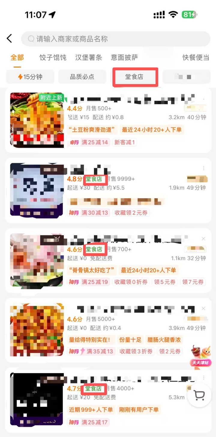 点进店铺后,检验首页顶部是否有显贵的“堂食店”教唆条。