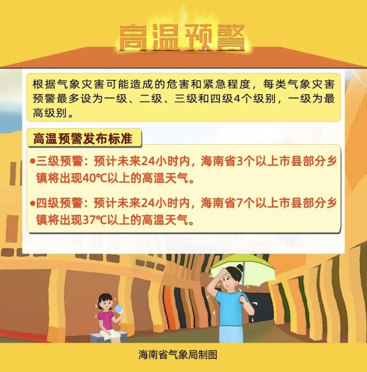 4月8日下昼,海南省风物局普及高温四级预警为高温三级预警:瞻望4月9日日间,海口、澄迈、临高、定安、屯昌、儋州、白沙、昌江和东方等9个市县的大部分州里将出现37℃以上的高温天气,其中昌江、白沙、儋州、临高和澄迈部分州里气温可达40℃以上,请联系单元作念好防暑降温、丛林防熄灭等联系使命。